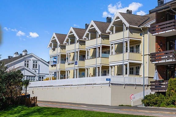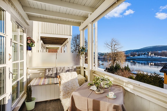 Attraktiv 4-roms leilighet. Grønt boligtun. Elveutsikt. Gangavstand til byen. Strandpark like ved. To balkonger. Garasje